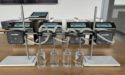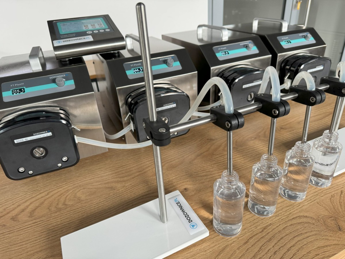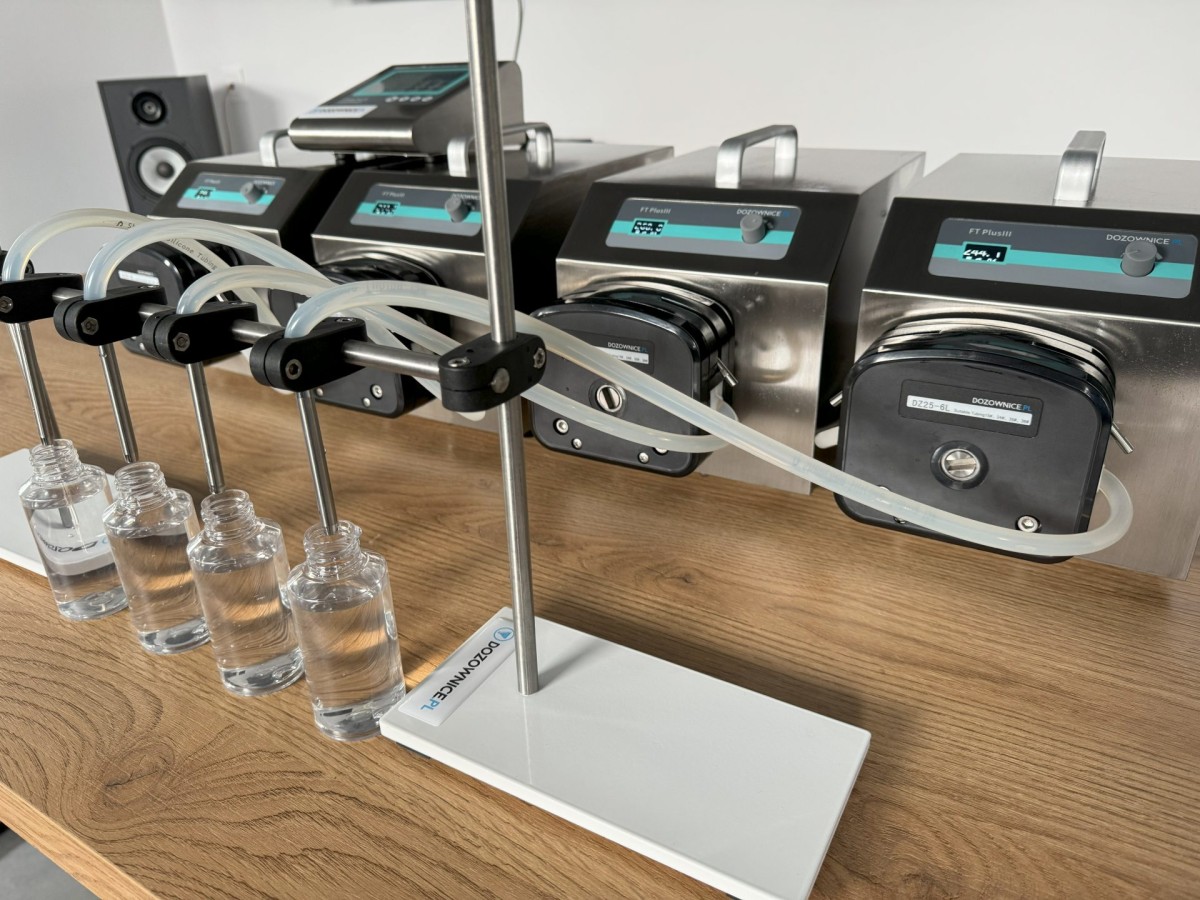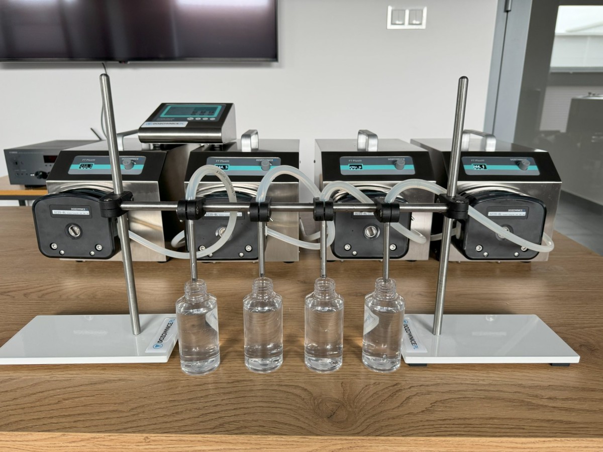 Dozownica może działać w trybie pracy manualnej (naciskając pedał) lub automatycznej, wcześniej ustawiając: dozę, szybkość dozowania oraz czas pomiędzy dozowaniami (czas na podstawienie następnej butelki).