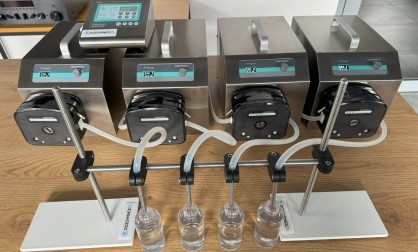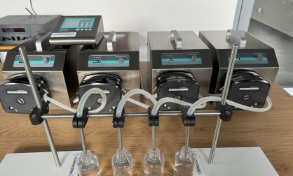 Dozownica może działać w trybie pracy manualnej (naciskając pedał) lub automatycznej, wcześniej ustawiając: dozę, szybkość dozowania oraz czas pomiędzy dozowaniami (czas na podstawienie następnej butelki).